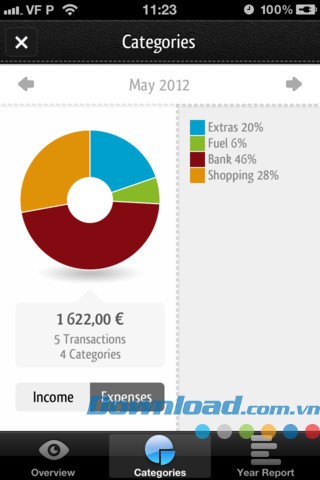 - Xem biểu độ dạng bánh với phần trăm danh mục cho tuần, tháng, năm hoặc toàn bộ.
