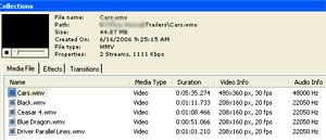 Cửa sổ Collections ở góc trái trên cùng là nơi người dùng đưa vào danh sách các file video cần chỉnh sửa và lắp ghép bằng cách nhấn menu File > Open. Chương trình hỗ trợ khá nhiều định dạng như avi, wmv, mpeg, vob, asf...