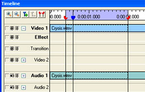 Để bắt đầu thực hiện quá trình chỉnh sửa, nhấn chuột trái vào một file video cần dùng rồi kéo thả vào dòng Video 1. Lúc này chương trình sẽ tự động chia tách phần âm thanh và đặt nó tại dòng Audio 1. Bạn sẽ làm quen với công cụ đánh dấu phim là dấu xanh (nút thứ 3 trên dòng menu của mục Timeline) và dấu đỏ (nút cuối cùng) sẽ chặn thời gian bắt đầu - kết thúc. Khoảng cách biểu thị thời gian này có thể kéo ra kéo vào dễ dàng bằng chuột. Điểm tiện dụng của chương trình là sau khi đánh dấu, bạn có thể xem đoạn video nhỏ này bằng cách bấm nút Play ở cửa sổ góc phải phía trên. Nhờ đó, quá trình chọn đoạn video trở nên dễ dàng.