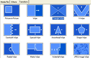 Thường thì khi cắt và nhập các đoạn video, người dùng sẽ muốn tạo hiệu ứng chuyển đổi một cách mềm mại. Lúc này, các đoạn video nên để so le nhau trên hai dòng Video 1 và 2 (kéo thả dễ dàng bằng chuột). Vào mục Transitions ở cửa sổ Collections, nhấn đúp chuột vào một hiệu ứng cần dùng > OK. Chương trình này có rất nhiều hiệu ứng thú vị như tạo thanh quét màn hình theo chiều kim đồng hồ, theo hình lỗ khoá, tam giác, ngũ giác, răng cưa... Ngay cả khi không cần chuyển tiếp giữa 2 video, bạn vẫn có thể đánh dấu xanh điểm cần chèn hiệu ứng rồi chọn lựa.