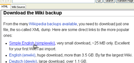 Đầu tiên, bạn cần tải về một tập tin XML bằng cách cuộn thanh trượt xuống dưới và chọn Download the Wiki backup và chọn các liên kết tải trang nội dung của Wikipedia. Nếu muốn tiết kiệm dung lượng, bạn nhấp vào liên kết Simple English (simplewiki) tại cửa sổ làm việc của chương trình.