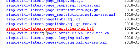 Trong danh sách hiện ra, bạn hãy tìm đến liên kết đến tập tin simplewiki-latest-pages-articles.xml.bz2 và nhấp vào đó để tải nội dung vào ổ cứng của máy tính. Tập tin này chứa đựng các nội dung bài viết, mẫu, hình ảnh, trang nội dung chính trên Wiki mà không cần tải bất kỳ nội dung nào khác. Xong đóng chương trình lại.