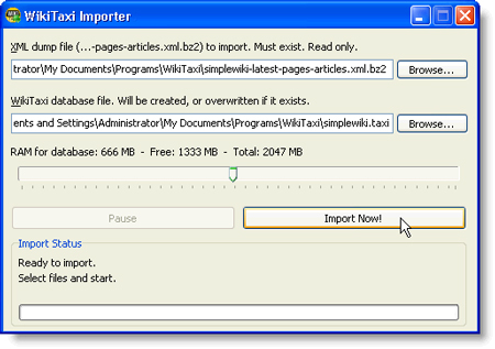 Cửa sổ WikiTaxi Importer hiện ra, bạn nhấp vào nút Browse của mục XML dump file để chỉ đường dẫn đến tập tin .xml.bz2 mà bạn vừa tải về. Tiếp tục nhấp vào nút Browse của mục WikiTaxi database file để chỉ đường dẫn đến nơi chứa dữ liệu sau khi trích xuất. Lưu ý: tên của tập tin tạo ra phải có phần mở rộng là *.taxi và tránh lưu vào nơi chứa file WikiTaxi.exe. Ngoài ra, trong khi giải nén bạn nên tránh làm việc nào khác tiêu tốn bộ nhớ RAM vì ứng dụng sử dụng bộ nhớ RAM để tiến hành giải nén, bạn có thể điều chỉnh mức sử dụng RAM bằng thanh trượt của mục RAM for database.