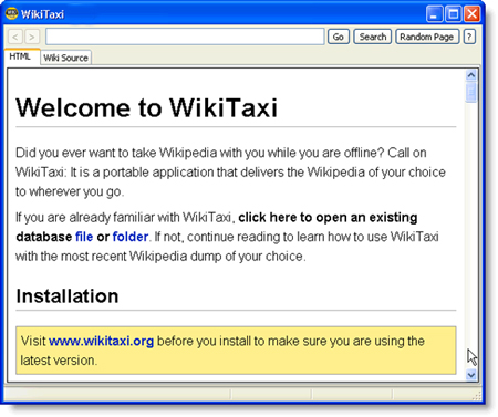 WikiTaxi là một tiện ích miễn phí cho phép bạn có thể đọc, tìm kiếm và duyệt nội dung Wikipedia một cách dễ dàng dù đang ở trạng thái offline. WikiTaxi sẽ dụng cách thức nén dữ liệu để đảm bảo nội dung của nó không lớn quá 8GB, do đó bạn có thể sao chép tất cả các kho kiến thức trên Wikipedia vào thiết bị USB dung lượng khoảng 8GB để mang đi kiểm tra mọi lúc mọi nơi, nghĩa là bạn cũng có thể mang hẳn một quyển bách khoa toàn thư vào máy tính của bạn dễ dàng.