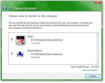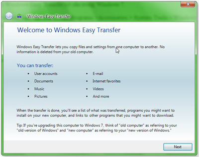 Trên Windows 7 của máy tính mới bạn chỉ cần Double click vào tập tin này nó sẽ mở ra một thuật sĩ của Easy Transfer, bạn chọn Transfer nếu muốn chuyển đổi tất cả các thiết lập từ máy tính A sang máy tính B và những gì có ở tài khoản của máy A sẽ nhanh chóng chuyển sang máy B.