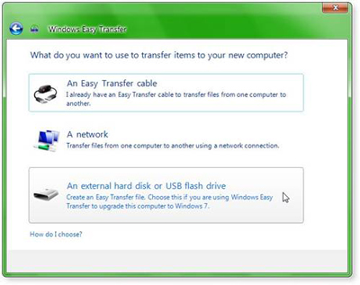 Bạn Click Next để tiếp tục, chọn phương thức chuyển đổi các thư mục và các thiết lập muốn sao chép, bạn có thể chọn An Easy Transfer Cable – Dùng cáp để nối kết hai máy với nhau rồi tiến hành sao chép, bạn có thể tìm thấy loại cáp này tại một số cửa hàng vi tính; nếu hai máy có kết nối mạng với nhau bạn có thể chọn hình thức thứ hai A network; còn không bạn nên chọn hình thức thứ ba An external hard disk or USB flash drive – dùng thiết bị lưu trữ ngoài như ổ cứng di động, CD/DVD, hoặc USB để sao chép và đem sang máy khác.