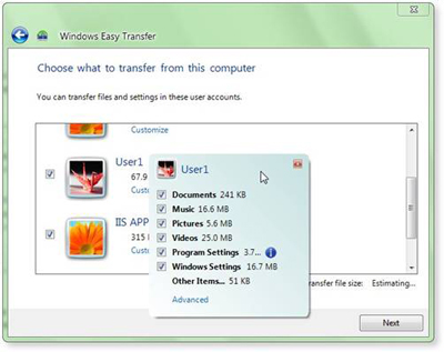 Nhưng với Windows 7 thì những lo lắng trên của bạn sẽ không còn nữa, bạn có thể di chuyển tài liệu, nhạc, ảnh, Email và nhiều thứ quan trọng khác từ một tài khoản của máy tính này sang máy tính khác một cách dễ dàng và giữ được tính nguyên vẹn các thiết lập đó với công cụ Windows Easy Transfer (WET) có sẵn trong Windows 7.