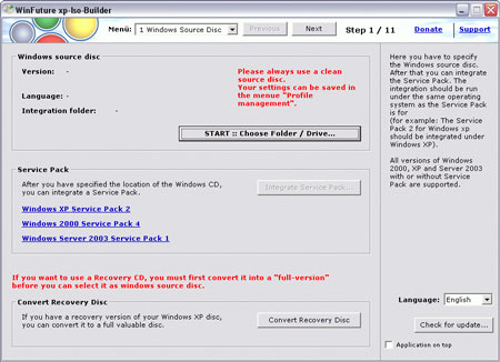Việc đầu tiên bạn cần làm là copy toàn bộ dữ liệu (tổng dung lượng khoảng 576 MB) có trong đĩa CD Windows XP SP2 vào một thư mục nào đó trên đĩa cứng (chẳng hạn C:\XP2). Tiếp đến, bạn mở giao diện tương tác của WF và thực hiện tuần tự 11 bước được giới thiệu bên dưới. Lưu ý: xong một bước, bạn bấm nút Next nằm phía trên để chuyển sang bước kế tiếp.