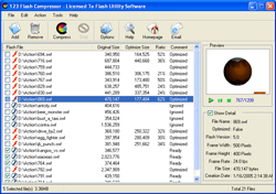 Trong quá trình lựa chọn các đoạn phim flash, bạn có thể kiểm tra nội dung của chúng bằng cách nhắp nút Play và theo dõi trong màn hình ở góc phải của giao diện. Bên dưới màn hình là những thông tin kỹ thuật liên quan đến đoạn phim.