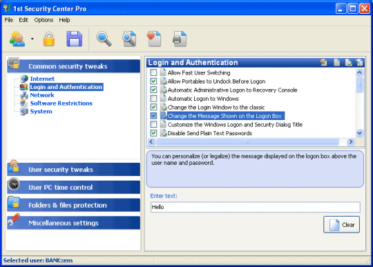 1st Security Center 7.5.5.51 là một tiện ích bảo mật mạnh, cho phép bạn có thể hạn chế sự truy cập vào một số tài nguyên quan trọng của hệ điều hành Windows. Tiện ích dễ sử dụng này sẽ giúp bạn bảo vệ máy tính của mình. Nó cho phép bạn áp đặt một số các hạn chế truy cập nhất định để bảo vệ sự riêng tư. Bạn có thể thiết lập từ chối truy cập cho một số thành phần trong Control Panel applets, chẳng hạn như Display, Network, Passwords, Printers, và System. Có thể vô hiệu hóa các phím khởi động, các chương trình DOS, việc thay đổi Registry và sự truy cập mạng. Bạn sẽ có khả năng ẩn các biểu tượng desktop của mình, các file nào đó, các mục trong menu Start và các tính năng của thanh công cụ, cho phép bạn có thể ngăn chặn không cho một số người dùng khác can thiệp vào desktop của bạn.