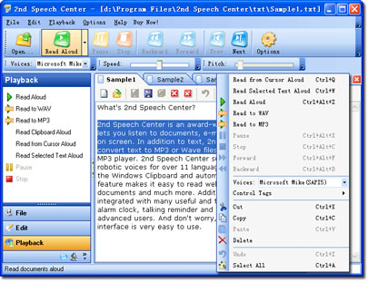 2nd Speech Center là một chương trình đọc văn bản được đánh giá cao, giúp bạn nghe các tài liệu, email, hay các trang web mà không cần đọc chúng trên màn hình máy tính. Thêm vào đó, 2nd Speech Center không những giúp bạn đọc các file văn bản mà còn lưu lại bài đọc thành file mp3, Wave để nghe lần sau với máy nghe mp3 của bạn.