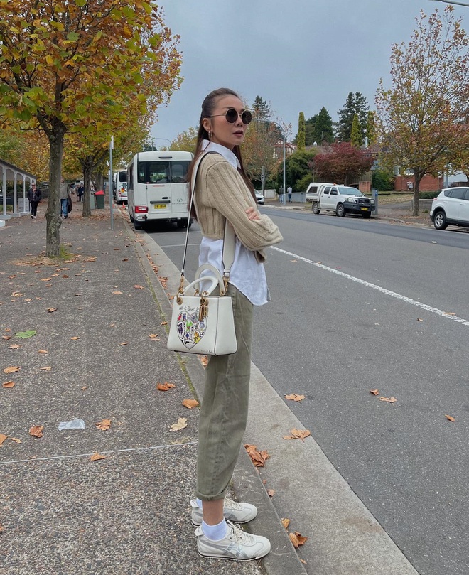 Để tôn dáng tối ưu khi đi giày sneaker trắng, Phạm Thanh Hằng chọn quần ống đứng dài trên mắt cá chân hoặc váy lửng. Giày sneaker trắng không chỉ phù hợp với phong cách dạo phố, quý cô trên 40 tuổi còn có thể tận dụng mẫu giày này để trẻ hóa thời trang công sở.