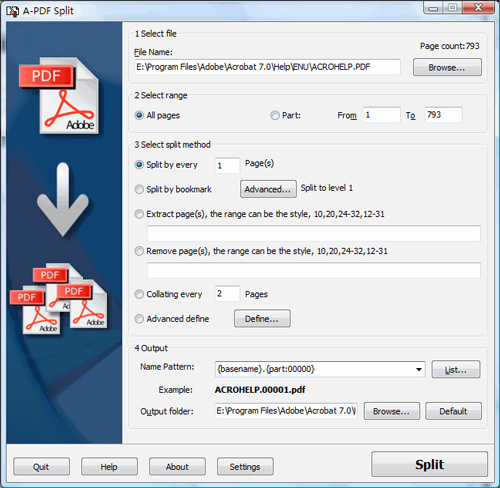 A-PDF Split là phần mềm đơn giản nhưng hoạt động nhanh, cho phép bạn chia bất kì file Pdf nào thành các file Pdf nhỏ hơn. Phần mềm này cung cấp cho người dùng sự tiện dụng và khả năng quản lý toàn diện trong việc cách các file được chia và cách đặt tên đối với file đầu ra. A-PDF Split cung cấp cho người dùng các cách thay thế khác nhau trong việc chia file – theo trang, theo bookmark,.... Thậm chí, bạn có thể trích xuất hoặc loại bỏ một phần của file PDF.