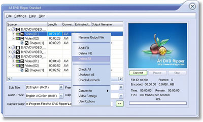 Cách sử dụng A1 DVD Ripper vô cùng dễ dàng. Bạn vào menu File -> chọn Open DVD Root -> chọn ổ đĩa DVD trên máy tính và nó sẽ tự động Add vào toàn bộ các “Chapter” (các phân đoạn phim trên đĩa DVD) -> Nếu DVD của bạn có thuyết minh hoặc phụ đề tiếng Việt thì vào nhắp vào ô Sub Title để chọn “Vietnamese”, vào Audio Track cũng chọn “Vietnamese”, vào Frame Rate để chọn số khung hình hiển thị trong một giây và chọn hệ PAL hoặc NTSC, vào Output Format để chọn định dạng xuất là Video CD, Super Video CD hoặc AVI -> Cuối dùng là nhấn nút Convert và chờ đợi cho đến khi nào quá trình chuyển đổi định dạng hoàn tất.