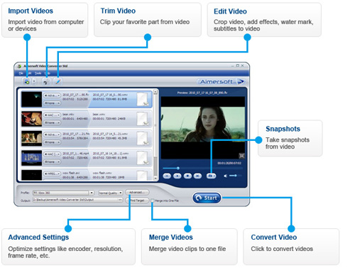 Aimersoft Video Converter Std là phần mềm chuyển đổi video tốt nhất, có thể giúp bạn chuyển đổi video giữa các định dạng khác nhau. Phần mềm này là chuyên gia trong việc chuyển đổi video HD như AVCHD và video SD: AVI, MP4, WMV, MOV, MPEG, Xvid với chất lượng đầu ra hoàn hảo cùng tốc độ thực hiện cao. Với phần mềm chuyển đổi video này, bạn có thể thoải mái chuyển đổi video dành choiPad, iPhone 4(4G), iPhone 3GS, iPod Touch, iPod Nano,Google nexus one,...