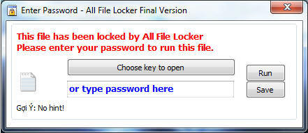 Để mở khóa tập tin, bạn chỉ cần nhấp đúp chuột vào tập tin đó. Nếu tập tin đó được bảo vệ bằng mật khẩu thì bạn chỉ cần nhập vào mật khẩu mở file là xong. Còn nếu tập tin đó được khoá bằng Key thì bạn bấm nút Choose key to open để chọn Key đã mã hoá lần trước. Sau đó bấm nút Run để mở khóa tập tin.