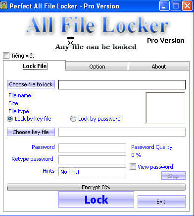 Từ giao diện chính, chọn tập tin để khóa bằng cách nhấp chuột vào mục Choose File to Lock. Tiếp theo bạn chọn kiểu khoá tập tin gồm: Lock by KeyFile hoặc Lock by Password cần thực hiện. Nếu bạn chọn bảo vệ file bằng mật khẩu, thì nhập vào khung Password, nhập lại mật khẩu lần hai vào khung Retype password. Khung Hints để bạn nhập cụm từ khoá gợi ý mật khẩu. Sau đó bấm nút LOCK để khóa file.