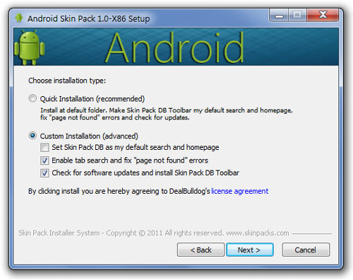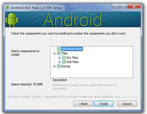 Android Skin Pack cũng như các gói giao diện đã xuất hiện trước đó, nó sẽ thay thế các tập tin hệ thống bằng các file do nhà phát hành chỉnh sửa cũng như sử dụng thêm một số tiện ích bổ sung để làm cho giao diện Windows 7 của bạn giống với giao diện Android trên Smartphone một cách hoàn hảo.