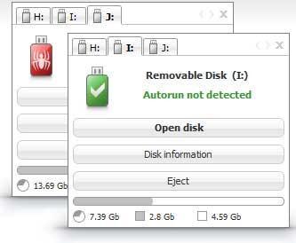 Antirun có giao diện đơn giản, mỗi một thiết bị kết nối sẽ được hiển thị trong một tab riêng biệt. Khi phát hiện mối đe dọa, nó sẽ nhắc nhở bạn nên xóa tập tin và sẽ loại bỏ chúng ngay khi được sự đồng thuận từ bạn. Thông qua Antirun, bạn có thể giải thoát không gian bộ nhớ hoặc xem thông tin bộ nhớ đã được sử dụng; vô hiệu hóa autorun...