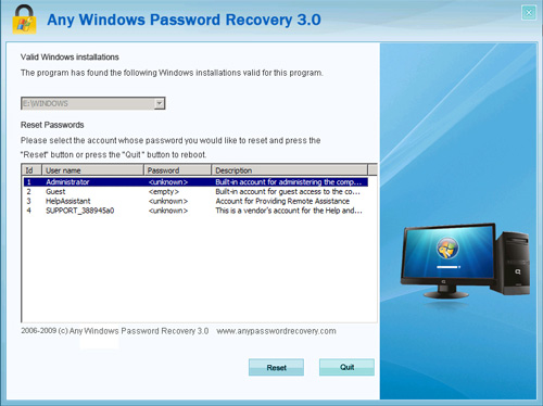 Any Windows Password Recovery 3.0 là công cụ khôi phục mật khẩu Windows chuyên nghiệp để khôi phục mật khẩu được dùng để đăng nhập vào Windows. Phần mềm này có thể đặt lại mật khẩu Windows chỉ trong một vài bước, và cho phép người dùng đặt lại mật khẩu hoặc theo mật khẩu Administrator hoặc mật khẩu người dùng trở thành mật khẩu trống ngay lập tức. Nó cho phép bạn đăng nhập vào Windows với tên một người dùng và mật khẩu trống tương tự. Phần mềm khôi phục mật khẩu Windows này với chức năng mạnh mẽ không chỉ khôi phục mật khẩu người dùng (có quyền Admin), mà còn khôi phục được mật khẩu Administrator mà có quyền chung cho toàn bộ hệ thống, cho phép người dùng quản lý toàn bộ dữ liệu trên máy tính. Any Windows Password Recovery hỗ trợ tất cả các phiên bản của hệ điều hành Windows, bao gồm cả hệ điều hành mới nhất Windows 7, Windows Vista/XP/2008/2003/2000/NT,... File ảnh ISO của phần mềm này có thể ghi được ra đĩa CD/DVD dễ dàng với tính năng ghi đĩa được tích hợp sẵn trong phần mềm.