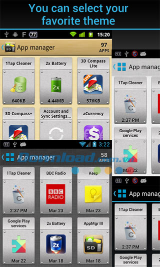 - Hiển thị cache/dữ liệu/mã/tổng kích cỡ của ứng dụng
