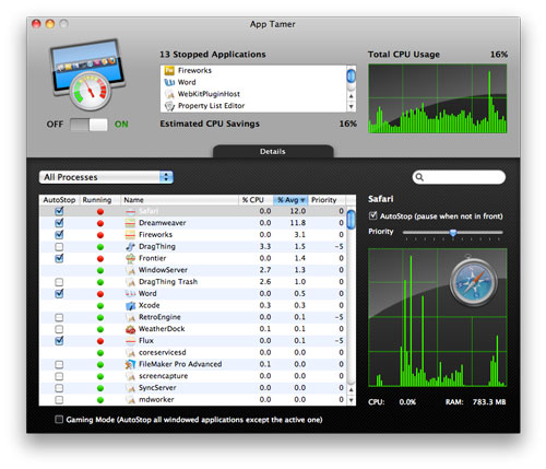 Điều này sẽ làm tiêu tốn năng lượng và giảm tuổi đời của pin. Tính năng AutoStop của App Tamer có khả năng tự động dừng những ứng dụng này khi bạn không cần tới chúng rồi khởi động chúng lại khi bạn kích vào chúng. Điều này sẽ giúp giải phóng CPU của bạn và giảm thiểu tiêu tốn năng lượng. Chương trình này có giao diện người dùng hấp dẫn và dễ sử dụng trong việc quản lý các ứng dụng đang chạy. App Tamer sẽ hiển thị phần trăm xử lý cho mỗi ứng dụng, và hiển thị bản ghi sử dụng CPU. Bạn có thể dễ dàng bật AutoStop cho bất kì một ứng dụng nào, cũng như thay đổi quyền ưu tiên xử lý của chúng trong OS X.
