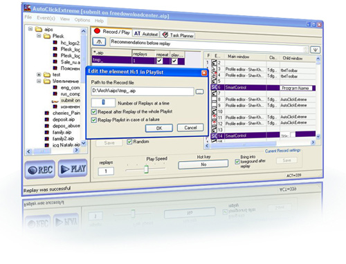 • Sử dụng Playlist đối với thử nghiệm phần mềm tự động. AutoClickExtreme sẽ thực hiện ngẫu nhiên một loạt các tác vụ, hoặc theo trật tự đã được lưu trong Playlist. Chương trình này sẽ kiểm tra các chương trình khác. Nó có thể thực hiện toàn bộ công việc mà không cần sự giúp đỡ của bạn, và bạn có thể chắc chắn rằng tất cả công việc sẽ được hoàn tất thành công.