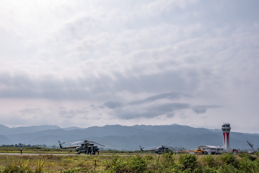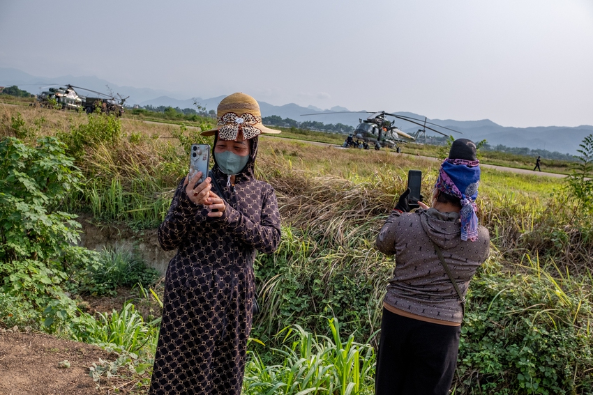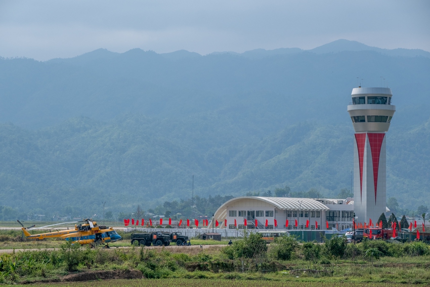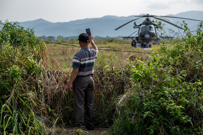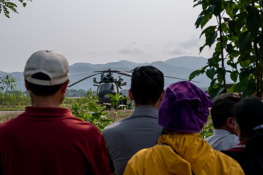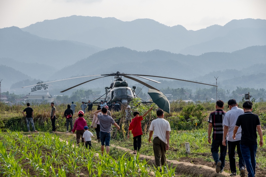 Nhiều người dân tập trung tại khu vực bên hông của Cảng hàng không Điện Biên Phủ để tận mắt chứng kiến những chiếc trực thăng Không quân Việt Nam.