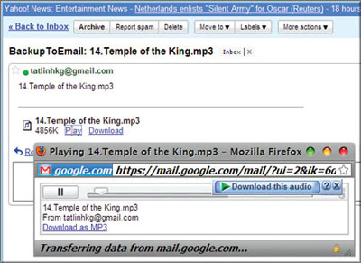 Nhắp chuột phải vào tập tin chọn Backup To Email trên menu ngữ cảnh. Bạn chờ giây lát sẽ có một cửa sổ hiển thị tiến trình tải tập tin. Sau khi kết thúc, bạn chỉ việc kiểm tra lại hộp thư Gmail của mình, sẽ thấy tên tập tin vừa được tải lên. Đối với các tập tin nhạc, ảnh số bạn có thể nghe và xem trực tiếp chúng trên Gmail bằng cách bấm vào tên tập tin trong Inbox, chọn Play để nghe chúng (với các tập tin nhạc MP3, WMA... hay View đối với ảnh số). Dĩ nhiên bạn có thể tải chúng về bất cứ lúc nào bằng nút Download nằm cạnh dữ liệu của bạn ở giao diện Gmail.