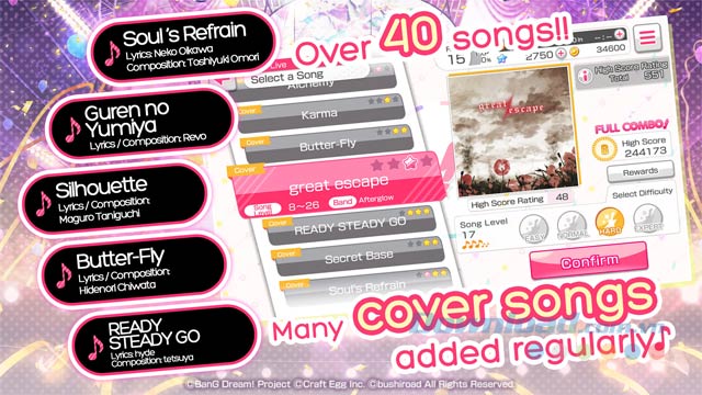 Đến với sân chơi này, bạn có cơ hội khám phá hơn 40 bài hát với sự kết hợp giữa các tác phẩm gốc và cover từ nhiều bài hát anime Nhật Bản nổi tiếng khác nhau. Bạn thu thập những thành viên trong ban nhạc thông qua một hệ thống gatcha, mở khóa câu chuyện khi bạn nhạc lên hạng. Trình diễn tốt mọi bài hát cho bạn quyền truy cập vào nhiều tác phẩm và item hơn nữa để giúp ban nhạc của bạn nổi tiếng. Độ khó của bài hát tăng dần và đòi hỏi bạn phải tập trung cao độ và vận dụng kỹ năng của mình để hoàn thành.