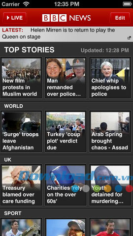 Tin tức được sắp xếp theo nhóm: tin tức Top, tin thời sự UK, thời sự thế giới, chính trị, kinh doanh, công nghệ và thể thao.