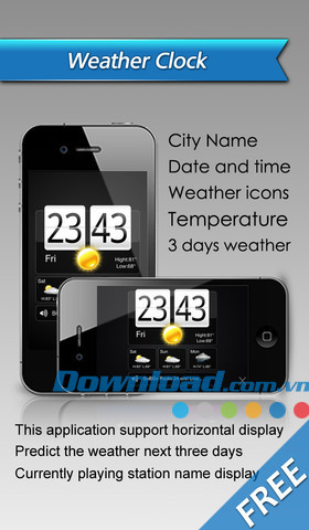- Hỗ trợ chức năng đồng hồ thời tiết: khi người dùng nghe đài vài phút trước, ứng dụng sẽ tự động hiển thị thời gian, ngày tháng, thời tiết, nhiệt độ... đồng thời hiển thị dự báo thời tiết 3 ngày tiếp theo.
