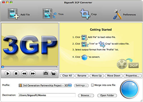Bigasoft 3GP Converter for Mac, một giải pháp chuyển đổi 3GP chuyên nghiệp dành cho Mac, cho phép bạn dễ dàng thưởng thức các file video trên hầu hết các thiết bị điện thoại di động như Samsung, Motorola, LG, BlackBerry, Nokia, Apple, HTC,.... Phần mềm mạnh mẽ này có thể dễ dàng chuyển đổi bất kì file phim nào, bao gồm AVI, MPEG, WMV, MP4, MKV, H.264, DivX, Xvid, MOV, RM, M4V, VOB, ASF, 3GP, MOD, TOD, MTS,...sang định dạng video 3GP/3G2/3GPP/MP4 trên hệ thống Mac.