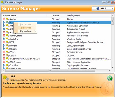 - Service Manager: trình quản lý tất cả các dịch vụ nội tuyến cũng như trực tuyến mà hệ thống đang chạy, với công cụ này bạn có thể dễ dàng quản lý và đóng đi các “dịch vụ” không thật sự cần thiết để tiết kiệm tối đa bộ nhớ (nhấp phải vào dịch vụ cần đóng - nếu đang hoạt động sẽ có hình mũi tên màu xanh, chọn Stop Device), xem hình 12.