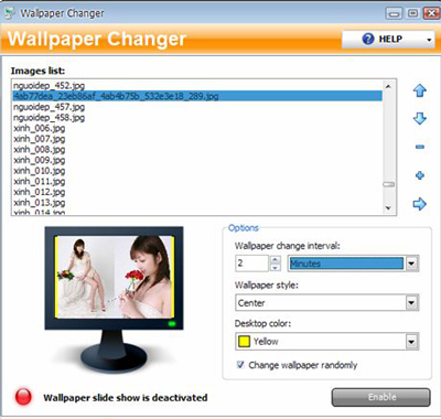 + Nhấp nút hình dấu“+”để đưa vào thư mục ảnh nền, thiết lập một số tùy biến tại mục Options: thời gian tự động thay đổi ảnh (tính theo đơn vị giây, phút, giờ hay ngày), chế độ hiển thị ảnh nền, màu sắc khung viền ảnh bên ngoài (nếu không chiếm hết không gian trên Desktop), thay đổi ảnh một cách ngẫu nhiên trong bộ sưu tập (Change wallpaper randomly).