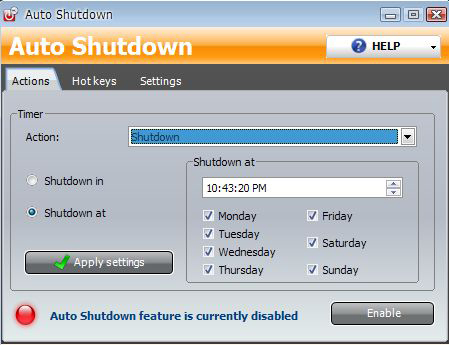 + Nhấp chọn chức năng, trên thẻ lệnh Action nhấp chọn tên hành động, có thể thiết lập thời gian thực hiện hành động theo hai mức Shutdown in (tắt máy vào một thời gian thực xác định trong ngày), Shutdown at (tắt máy vào một thời gian thực trong các ngày tùy chọn của tuần).