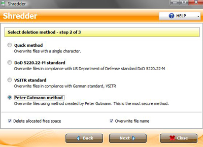 + Trong 4 phương pháp mà chương trình gợi ý để xóa dữ liệu mật, bạn nên chọn thuật toán Peter Gutmann để thanh lý một cách an toàn nhất (đây là thuật toán xóa dữ liệu “mật” phức tạp và có độ tin cậy cao nhất cho tới thời điểm này, theo kiểm nghiệm của tôi ngay cả chương trình Recover my Files bản mới nhất cũng không thể phục hồi lại được những dữ liệu mà thuật toán này thanh lý), xem hình 7.