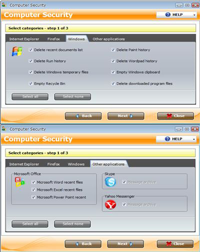 + Ở bước thiết lập các tùy biến bảo mật chương trình hỗ trợ 4 nhóm thẻ lệnh theo chủ đề tương ứng: Internet Explorer (các thiết lập cho IE như xóa bộ nhớ Cache, xóa cookies, xóa lịch sử truy cập, xóa toàn bộ các danh sách dữ liệu AutoComplete ghi nhớ trong quá trình duyệt web), FireFox (các thiết lập tương tự cho trình duyệt FireFox), Windows (xóa lịch sử thao tác trên Windows, tập tin rác, các dữ liệu download về hệ thống qua quá trình lướt web), Other Applications (xóa lịch sử dùng các tập tin trong bộ MS Office, lịch sử dữ liệu của các chương trình hội thoại trực tuyến Sky, Yahoo Mess), xem hình 8.