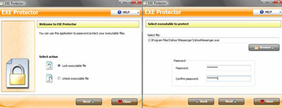 + Nhấp nút Browse để đưa vào ứng dụng EXE cần khóa (ví dụ Yahoomessenger.exe), thiết lập mật khẩu bảo vệ xong nhấp Next, xem hình 9.