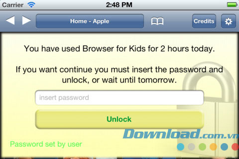 Bên cạnh đó, Browser for Kids Lite for iOS còn cung cấp một giới hạn thời gian duyệt web hàng ngày tùy chọn: cha mẹ có thể thiết lập tổng số giờ cho phép trẻ em duyệt web mỗi ngày. Sau thời gian cài đặt này, màn hình sẽ chuyển sang trạng thái khóa và chỉ được mở khóa khi cha mẹ nhập mật khẩu truy cập vào hoặc chờ đến ngày kế tiếp để mở khóa tự động và tiếp tục sử dụng.