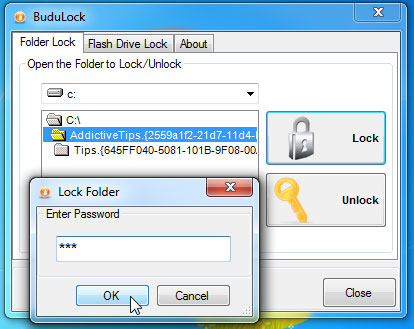 Tiếp đến, bạn nhấn nút Lock, điền mật khẩu bảo vệ thư mục vào ô Enter Password và nhấn OK.