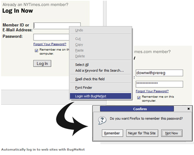 Nếu bạn sử dụng trình duyệt Firefox, việc sử dụng sẽ thuận tiện hơn nhiều với extension BugMeNot để giúp bạn tự động đăng nhập các trang web mỗi khi bạn mở nó lên. Sau khi cài đặt Extension này, mỗi lần đăng nhập vào một website nào đó, bạn chỉ cần nhấn phải chuột vào Form đăng nhập chọn Login with BugMeNot, chương trình sẽ tự động tìm tài khoản và điền vào cho bạn. Nếu đăng nhập không thành công, BugMeNot sẽ tiếp tục tìm và thay đổi tài khoản khác cho đến khi đăng nhập được.