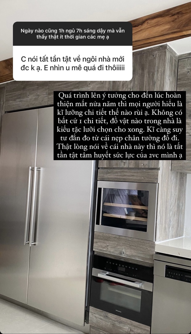 Tuy nhiên, cô nàng cũng bày tỏ sự tiếc nuối căn nhà cũ: "Nhà mới đẹp thật đẹp, rộng thật rộng nhưng nằm một lúc lại nhớ ngôi nhà cũ, nhớ thật nhớ. Lần đầu bước chân vào nhà ấy cô bé mới chỉ 19 tuổi. Yêu đương, lấy chồng, đẻ con, làm việc, nấu nướng, khùng điên, buồn vui, khóc cười, hờn giận, hụt hẫng, hi vọng… 1000 thứ cảm xúc diễn ra chỉ có bản thân mình và ngôi nhà là chứng kiến từ đầu đến cuối không bỏ sót phân đoạn nào. Giờ rời đi thấy nhớ và thương nhà cũ thế nào ấy".