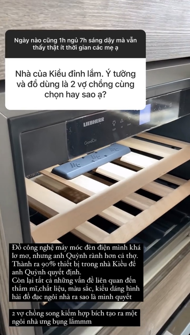 "Đồ công nghệ máy móc đèn điện mình khá lơ mơ nhưng anh Quỳnh rành hơn cả thợ. Thành ra 90% thiết bị trong nhà để cho anh Quỳnh quyết định. Còn lại tất cả những vấn đề liên quan đến thẩm mỹ, chất liệu, màu sắc, kiểu dáng hình hài đồ đạc ngôi nhà ra sao là mình quyết. 2 vợ chồng song kiếm hợp bích tạo ra một ngôi nhà ưng bụng lắm" - Kiều Anh chia sẻ.