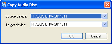 Nếu như bạn đang sở hữu một đĩa CD/DVD audio hay dữ liệu muốn sao chép chúng ra một đĩa mới thì tính năng Copy disc sẽ giúp bạn làm việc này. Sau khi dấu chọn đặt trước mục Copty disc, bạn lựa chọn hình thức sao chép đĩa dữ liệu hay nhạc. Cửa sổ tiếp theo hiện ra, bạn hãy chọn ổ đĩa nguồn chứa dữ liệu muốn sao chép và ổ đĩa sẽ tiến hành ghi tại cửa sổ hiện ra và nhấn OK. Nếu như bạn chỉ có một ổ đĩa thì bạn có thể khai báo cả hai là cùng một ổ đĩa nhưng bạn phải mất thêm công 2 lần mở ổ đĩa để nạp đĩa gốc và đĩa trắng vào cho chương trình xử lý.