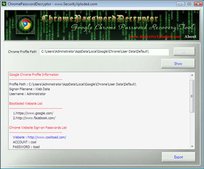 ChromePasswordDecryptor là công cụ giúp bạn dễ dàng mã hóa hoặc khôi phục các thông tin đăng nhập đã được lưu ở trình duyệt Chrome. Công cụ sẽ tự động nhận diện đường dẫn của profile mặc định và hiển thị tất cả các thông tin đăng nhập (kể cả các thông tin quan trọng bạn không lưu qua lựa chọn Remember) sau khi giải mã chúng. Ngoài ra, công cụ còn hiển thị “danh sách đen” tất cả các website mà bạn không lựa chọn lưu mật khẩu và cho phép bạn trích xuất những thông tin đăng nhập quan trọng với định dạng HTML để sao lưu phòng trường hợp trình duyệt Chrome bị lỗi.