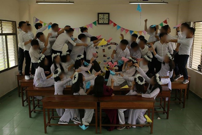 "Ban đầu anh có hẹn với bọn em ngày 27/5 6h30 có mặt đầy đủ ở trường để bắt đầu chụp. Vì lo chuẩn bị trang điểm mà có những bạn nữ phải tới lúc 5h cho kịp giờ hẹn, vất vả đấy anh, trời hôm đó nắng nóng chứ không có mát đâu. Tưởng tượng cảnh sáng sớm lên trường, trang điểm chuẩn bị, cả lớp 6h30 đã lo tập trung đầy đủ, cả cô giáo của tụi em cũng tới từ sớm.