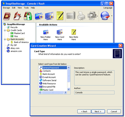 Hàng ngày làm việc với Internet bạn phải lưu giữ hàng chục loại mật khẩu từ mật khẩu đăng nhập Web, mật khẩu eMail rồi lại tài khoản ngân hàng v.v... Đã đến lúc tìm một giải pháp an toàn, đó chính là Comodo i-Vault. Comodo i-Vault có khả năng tự động lưu giữ tài khoản, mật khẩu của bạn và được ví như một cuộc cách mạng hóa trong phương cách quản lý và bảo mật thông tin quan trọng. Comodo i-Vault còn có thể: