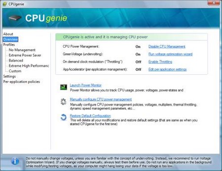 Nếu như bạn muốn có sự tiện lợi của CPUGenie nhưng lại thích sự miễn phí của RMClock/CrystalCPUID, bạn có thể sử dụng CPUGenie để tìm ra mức Vcore tối ưu cho CPU của mình, sau đó sử dụng RMClock/CrystalCPUID để thiết lập mức Vcore tương ứng. Tiện cả đôi đường phải không? Nhưng giải pháp này vẫn chịu các hạn chế của RMClock/CrystalCPUID, trong đó có việc hỗ trợ hạn chế CPU đời mới và không hỗ trợ tốt các hệ điều hành mới.