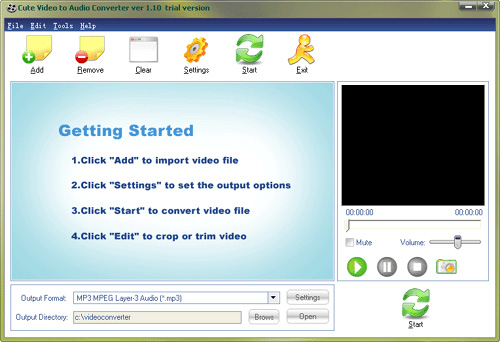 Cute Video to Audio Converter là phần mềm chuyển đổi video dễ sử dụng nhất hiện có. Phần mềm này có thể chuyển đổi rất nhiều định dạng video như DivX, XviD, MOV, MPEG-4, MPEG, WMV, H.263, AVI, WMV, ASF sang định dạng audio mp3, ogg, wma, wav và aac.